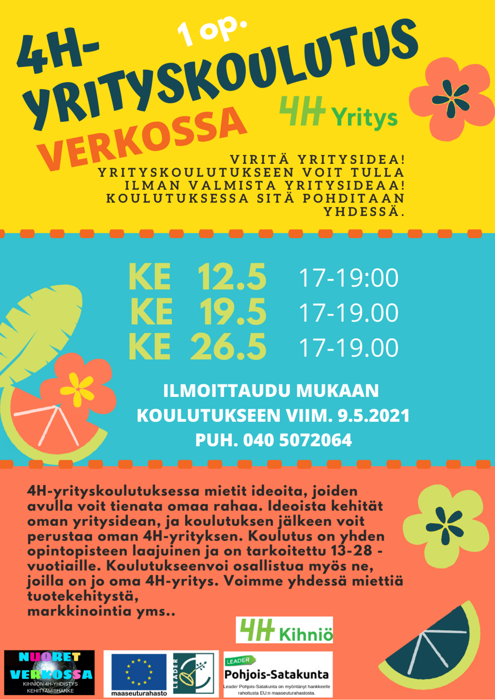 Sinulla on mahdollisuus osallistua 4H-yhdistyksen järjestämään yrityskoulutukseen, joka on yhden opintopisteen laajuinen. Koulutuksessa saat hyvä valmiudet 4H-yrityksen perustamiselle.